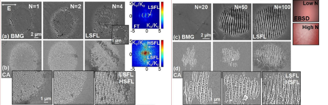 圖 1.以F=0.38 J/cm2(a,b)和F=0.15 J/cm2(c,d)的線性偏振激光脈沖輻照后BMG(a,c)和CA(b,d)樣品表面的掃描電鏡圖像。插圖中顯示了CA形狀的放大區(qū),以及BMG表面無(wú)定形和結(jié)晶相的EBSD結(jié)構(gòu)評(píng)估。較高通量值(N=1,2,4)時(shí)使用的脈沖數(shù)較少,而較低通量情況下使用的脈沖數(shù)較多(N=20,50,100)。(a)中的插圖給出了在N=4時(shí)較高通量F=0.6 J/cm2的例子。LSFL表示通常垂直于激光偏振方向形成的LSFL波紋。(a,b)中給出了BMG和CA情況下N=4脈沖時(shí)LIPSS的二維傅立葉變換(FT)表示法,顯示了LSFL和HSFL的發(fā)展及其在空間-頻率空間(K空間)中的特定空間周期性。
