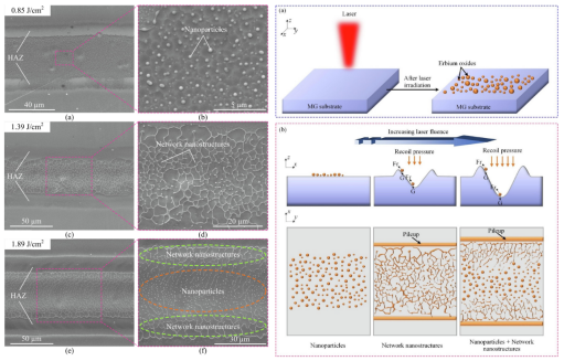 對(duì)此,他們還對(duì)這種結(jié)構(gòu)的形成及演化進(jìn)行了討論(如圖2所示),能量相對(duì)較低時(shí),納米粒子以離散形式出現(xiàn)在照射區(qū)域;當(dāng)將能量增加時(shí),除熱影響區(qū)外,照射區(qū)域呈現(xiàn)出大面積的網(wǎng)絡(luò)納米結(jié)構(gòu)。這些網(wǎng)絡(luò)納米結(jié)構(gòu)并不總是完全封閉的,尤其是在輻照區(qū)域的中心。隨著能量進(jìn)一步增加,整個(gè)輻照區(qū)域具有熱影響區(qū)周圍的網(wǎng)絡(luò)納米結(jié)構(gòu)和位于輻照區(qū)域中心的納米顆粒兩種結(jié)構(gòu)。并且,隨著激光能量密度的增加,這種納米粒子的數(shù)量不斷增多,當(dāng)數(shù)量過(guò)多時(shí)兩兩相互連接形成納米線,或者納米網(wǎng)格結(jié)構(gòu),納米顆??蓺w因于激光誘導(dǎo)的元素富集(即無(wú)定形氧化鉺)及其與基材的潤(rùn)濕性不匹配。此外,在反沖壓力和表面形貌的共同影響下,納米粒子的擴(kuò)散和連接會(huì)導(dǎo)致網(wǎng)絡(luò)納米結(jié)構(gòu)的形成。這種納米顆粒和納米網(wǎng)格的應(yīng)用十分廣泛,如作為增強(qiáng)材料等。