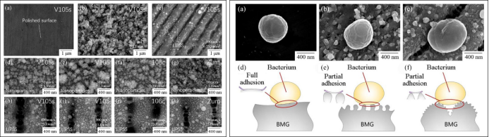 圖3.左圖為:飛秒激光納米結(jié)構(gòu)表面的形貌:(a)V105s的拋光表面;(b)V105s的納米粒子結(jié)構(gòu)表面;(c)V105的LIPSS;(d-g)Zr-BMGs的納米顆粒結(jié)構(gòu)表面;(h-k) Zr-BMG的LIPSS。右圖為:金黃色葡萄球菌在(a)拋光表面、(b)納米顆粒結(jié)構(gòu)表面和(c)LIPSS上的表面接觸狀態(tài)。表面細(xì)菌粘附狀態(tài)示意圖(d)在拋光表面上,(e)在納米結(jié)構(gòu)表面上和(f)在LIPSS上。