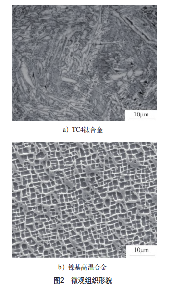 為了滿足在高溫高壓環(huán)境下的穩(wěn)定服役要求,航空發(fā)動機葉片常用材料為鈦合金或高溫合金,近年來,鈦鋁金屬間化合物也成為一種極有應(yīng)用潛力的葉片材料。鈦合金具有導(dǎo)熱性低、塑性低、彈性模量低以及親合力強等特點,使其切削過程中出現(xiàn)切削力大、切削溫度高、加工硬化嚴(yán)重和刀具磨損大等問題,是典型的難加工材料(微觀組織形貌見圖2a)[7]。高溫合金的主要特點是塑性及強度高,導(dǎo)熱性差,并且內(nèi)部含有大量致密的固溶體[8]。在切削過程中塑性變形使得晶格嚴(yán)重扭曲,變形抗力大,導(dǎo)致切削力大并伴隨嚴(yán)重的冷硬現(xiàn)象,也是典型的難加工材料(微觀組織形貌見圖2b)。因此,研發(fā)鈦合金與高溫合金等難加工材料的高效精密切削技術(shù)至關(guān)重要。為了實現(xiàn)難加工材料的高效精密加工,國內(nèi)外學(xué)者從創(chuàng)新切削加工方法、優(yōu)選加工刀具材料以及優(yōu)化切削參數(shù)等方向進行深入研究。