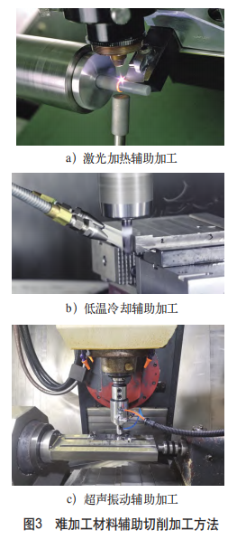 低溫冷卻輔助加工[10](見圖3b)則是使用液氮、高壓二氧化碳氣體等冷卻介質(zhì)噴涂到切削部位,對切削加工過程進行冷卻,避免因為材料導(dǎo)熱性能差引起的局部切削溫度過高問題,還使得工件局部冷脆,增強斷屑效果。英國的Nuclear AMRC公司成功使用高壓二氧化碳氣體對鈦合金的加工過程進行冷卻,與干切削狀態(tài)對比分析表明,低溫冷卻輔助加工不僅能夠降低切削力,提高切削加工表面的質(zhì)量,還能有效減小刀具磨損,增長刀具的使用壽命。此外,超聲振動輔助加工[11,12](見圖3c)也是難加工材料高效切削加工的有效方法。通過在刀具上施加高頻、微小幅度的振動,實現(xiàn)加工過程中刀具與工件之間發(fā)生間斷性分離,改變了材料去除機理,增強了動態(tài)切削的穩(wěn)定性,有效避免刀具與已加工表面間的摩擦,降低切削溫度和切削力,降低表面粗糙度值,減小刀具磨損,其優(yōu)良的工藝效果已經(jīng)得到廣泛的關(guān)注。