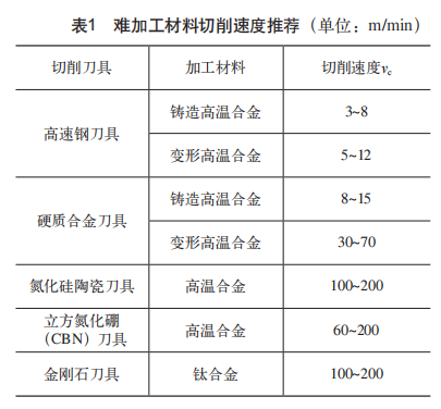 切削參數(shù)同樣是影響加工效果的重要因素,對應(yīng)材料使用合適的切削參數(shù)加工能夠有效提高加工質(zhì)量與效率。以切削速度參數(shù)為例,切削速度低容易在材料表面形成積屑瘤區(qū),降低表面加工精度;切削速度高容易發(fā)生熱量積聚,引起工件和刀具的燒傷。對此,哈爾濱理工大學(xué)翟元盛教授團隊分析常用難加工材料的機械物理性質(zhì),通過正交加工試驗總結(jié)出難加工材料切削速度推薦表[14](見表1),使用表中推薦的刀具和切削速度進行加工能夠有效減小加工缺陷與刀具磨損,提高加工質(zhì)量。