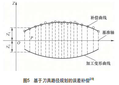 基于上述的預(yù)測模型或在機測量技術(shù),人們能夠?qū)庸?shù)進行優(yōu)化甚至是實時調(diào)控。主流的方向是通過刀具路徑的重新規(guī)劃來對變形和振動造成的誤差進行補償。這一方向常用的方法是“鏡像補償法”[20](見圖5),該方法通過對名義刀具軌跡進行修正,補償單次切削的變形量。但是單次補償會產(chǎn)生新的加工變形,因此需要通過多次補償在切削力和加工變形之間建立迭代關(guān)系,逐次修正變形量。除了基于刀具路徑規(guī)劃進行主動誤差補償?shù)姆椒ㄖ?,許多學(xué)者也在研究通過優(yōu)化調(diào)控切削參數(shù)、刀具參數(shù)等方式來控制變形和振動。對于某型號航空發(fā)動機葉片的切削加工,改變加工參數(shù)進行多輪正交試驗,基于試驗數(shù)據(jù)分析各切削參數(shù)、刀具參數(shù)對葉片加工變形、振動響應(yīng)的影響規(guī)律[21-23],建立經(jīng)驗預(yù)測模型,從而優(yōu)選加工參數(shù),有效減小