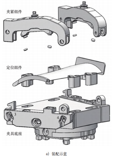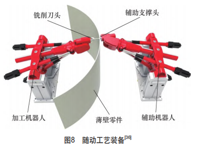 目前在工藝裝備設(shè)計過程中,普遍使用有限元分析、遺傳算法等手段來優(yōu)化多點輔助支撐的布局[35],但是優(yōu)化的結(jié)果通常只能保證在一點上的加工變形量達到最小,而并不能保證在其他加工部位也能起到同等的抑制變形效果。在葉片加工過程中,通常在同一機床上對工件進行一系列的走刀加工,但加工不同部位的裝夾需求是不同的,甚至可能是時變的。對于靜態(tài)多點支撐方法,如果通過增加輔助支撐的數(shù)量來提高工藝系統(tǒng)剛度,一方面會增大工裝的質(zhì)量和體積,另一方面也壓縮了刀具的運動空間。而如果在加工不同部位時重新設(shè)置輔助支撐的位置,則必然會中斷加工過程,降低加工效率。因此,根據(jù)加工過程自動在線調(diào)節(jié)支撐布局和支撐力的隨動工藝裝備[36-38]被提出。隨動工藝裝備(見圖8)能夠在任一加工工序開始前,基于時變切削過程的刀具軌跡與工況轉(zhuǎn)變,通過刀具與工裝的協(xié)同配合實現(xiàn)動態(tài)支撐:先將輔助支撐移動到有助于抑制當(dāng)前加工變形的位置,使工件的加工區(qū)域受到積極支撐,而工件其他部位在盡可能少的接觸下保持定位不變,從而匹配加工過程中時變的裝夾需求。