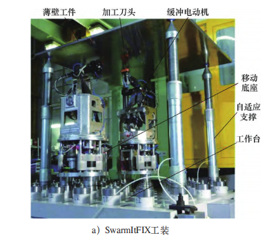 目前,國內(nèi)外學(xué)者均在自重構(gòu)群夾具方面進行了一些研究與嘗試。國外方面,歐盟項目SwarmItFIX開發(fā)了一種新的高度適應(yīng)性自重構(gòu)夾具系統(tǒng)[41],該系統(tǒng)使用一組移動輔助支撐在工作臺上自由移動并實時重新定位,以更好地支撐加工零件。SwarmItFIX系統(tǒng)的原型已在該項目中實現(xiàn)(見圖9a),并在一家意大利飛機制造商的場地上進行了測試。國內(nèi)則是有清華大學(xué)王輝團隊制作了一種可與機床協(xié)同控制的四點裝夾支撐工作臺[42](見圖9b),可以在渦輪葉片榫根的精加工過程中對處于懸臂狀態(tài)的榫根進行支撐以及自動刀具避讓。在加工過程中,四點輔助支撐與數(shù)控加工中心協(xié)同配合,根據(jù)刀具運動位置重構(gòu)四點接觸狀態(tài),既避免了刀具與輔助支撐相互干涉,又保證了支撐效果。