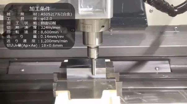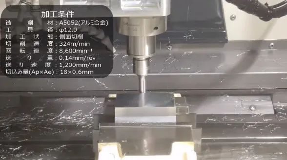 A5052鋁合金工件進(jìn)行側(cè)面切削加工,使用直徑12mm銑刀,加裝在新產(chǎn)品NAKANISHI高速電主軸BMS-5010進(jìn)行加工,下面松本機(jī)電就來簡單展示加工時(shí)參數(shù)。