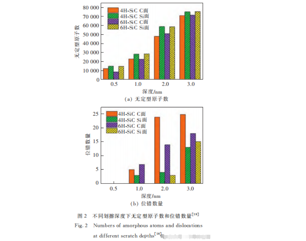 2020年,Z.G.Tian等人采用分子動力學模擬方法,對4H-SiC和6H-SiC的C面和Si面進行了劃痕實驗,研究表明,與Si面相比,C面的非晶態(tài)變形更少,材料的去除更有效,這種劃痕現(xiàn)象與SiC晶體基面上的位錯有關(guān)。圖2為不同試件在不同劃擦深度下無定型原子數(shù)和位錯數(shù)量。2021年,P.Zhou等人采用分子動力學方法研究了多磨粒隨機分布的固結(jié)磨料拋光SiC基片的表面形貌、亞表面損傷特征。結(jié)果表明,多磨粒在單一粗糙面中的暴露高度和磨粒分布決定了SiC襯底的去除行為;金剛石顆粒在固結(jié)磨料拋光墊中的隨機分布會使加工質(zhì)量變差。