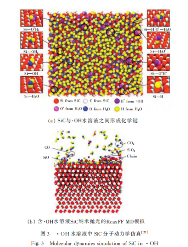 2022年,Y.He等人通過反應(yīng)分子動力學模擬和實驗的方法,研究了PCMP羥基自由基水溶液中化學與機械相互促進機制。通過單顆粒磨粒在SiC表面的劃擦,研究了納米顆粒在拋光過程中促進化學反應(yīng)的行為。Si/C原子主要以SiO、CO、SiO2和CO2的形式斷裂或逃逸。此外,X射線光電子能譜(XPS)和納米壓痕的結(jié)果也驗證了PCMP化學和機械相互促進的去除機制。通過檢測到的氧化產(chǎn)物、表面硬度,表明該工藝活化并去除SiC材料,產(chǎn)生光滑且無損傷的表面,Ra為0.269nm。