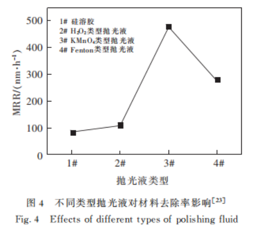 在目前的報道中,對于拋光液的研究思路包括改變氧化劑的種類和濃度、溶液pH值、分散劑、磨料等方法。通過調(diào)節(jié)拋光液中不同成分的含量,控制機械磨損與化學反應(yīng)之間的平衡,對獲得高MRR和無原子平面缺陷的表面起著關(guān)鍵作用。