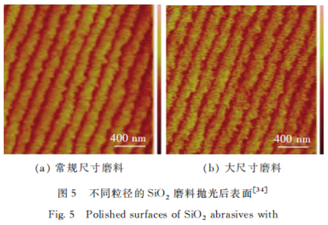 此外,也研究了不同粒徑的同種磨料對機械作用的影響。2014年,X.L.Shi等人詳細分析了不同磨料粒徑的硅溶膠對4H-SiC晶圓拋光性能的影響。通過理論推導和實驗分析得出,當磨料粒徑較大時會導致不規(guī)則的平臺邊緣。反之,如果磨料粒徑較小,材料的去除將更規(guī)則,并且平臺邊緣將更平坦和光滑,指出磨料粒徑是決定CMP效率和晶圓表面最終平坦化質(zhì)量的重要因素。圖5所示為不同粒徑SiO2磨料拋光后的表面,其中常規(guī)尺寸磨料平均粒徑30.8nm,大尺寸磨料平均粒徑79.3nm。
