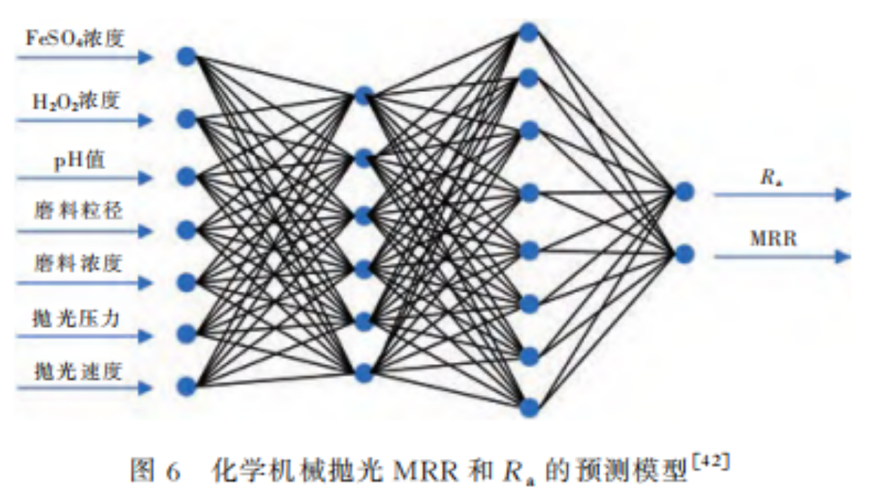 工藝參數(shù)與MRR、Ra之間的關(guān)系也可以通過建立模型來進行預測,為SiC的CMP加工提供參考。2021年,J.Y.Deng等人基于改進的Preston方程,研究了工藝參數(shù)對SiC拋光MRR和Ra的影響,并利用反向傳播神經(jīng)網(wǎng)絡(luò)建立了MRR和Ra的預測模型,如圖6所示。結(jié)果表明,隨著FeSO4質(zhì)量分數(shù)、H2O2質(zhì)量分數(shù)和pH值的升高,MRR呈先升高后降低的趨勢,拋光后Ra呈先降低后升高的趨勢。隨著磨料粒徑、磨料濃度、拋光壓力和拋光速度的增加,MRR不斷增大。Ra隨磨料粒徑和磨料濃度的增加而不斷減小,隨著拋光壓力的增加而增大,隨著拋光速度的增加而先減小后增大。不難看出,在SiC單晶的CMP中通過工藝優(yōu)化,對拋光效果起到了一定的改善和提高作用。