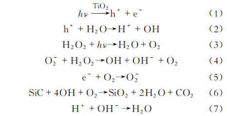 光催化化學機械拋光(PCMP)示意圖如圖7所示。將單晶SiC工件粘貼在拋光頭底端,使用含有光催化劑的拋光液,通過紫外光的照射,光催化劑顆粒表面產(chǎn)生空穴和電子,吸附在光催化劑顆粒表面的H2O和OH-可通過光生電子和空穴氧化成羥基自由基,然后將單晶SiC表面氧化成SiO2,化學反應(yīng)式為