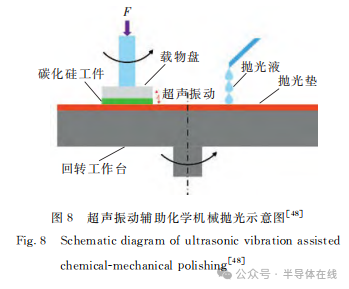超聲振動輔助化學機械拋光(UVACMP)是一種經(jīng)濟有效地提高SiC單晶拋光性能的技術(shù)。通過超聲波發(fā)生器將電信號轉(zhuǎn)換成超聲振動,超聲振動作用在拋光區(qū),使拋光液中磨料更加分散,并且使磨料獲得一定動能,加大了拋光中的機械作用,同時振動過程中產(chǎn)生的熱促進了拋光中的化學作用,超聲振動輔助化學機械拋光示意圖如圖8所示。