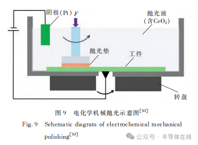 電化學機械拋光(ECMP)示意圖如圖9所示。ECMP是一種利用電解液作為拋光液,將工件的電化學腐蝕與機械拋光相結(jié)合的精密工藝。在單晶SiC(作為陽極)表面帶電后通過陽極氧化產(chǎn)生氧化層,然后用軟磨料機械去除氧化層,最后獲得超光滑無損傷的表面。