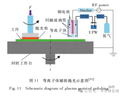 等離子體輔助拋光(PAP)是一種將大氣等離子體照射與軟磨料拋光相結(jié)合的精密拋光技術(shù)。PAP技術(shù)由K.Yamamura于2010年提出,圖11為PAP示意圖(圖中DPM為露點儀,MFC為質(zhì)量流量控制器、UPW為超純水),該裝置由獨立安裝的等離子體產(chǎn)生和機械去除部分組成。大氣等離子體輻照可在單晶SiC表面形成氧化層,通過機械裝置去除氧化層后,獲得無內(nèi)應(yīng)力、無SSD的原子級光滑表面。