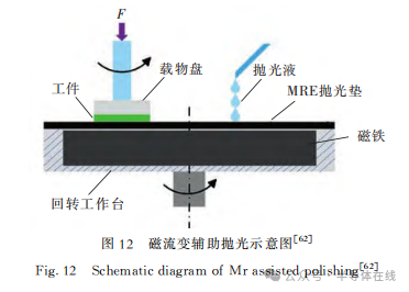 磁流變輔助拋光引入磁流變彈性體(MRE),與化學機械拋光相結(jié)合,在外加磁場、磁性拋光墊、氧化還原反應(yīng)的共同作用下,提高工件的材料去除率,降低表面粗糙度,實現(xiàn)對工件的超精密加工。磁流變輔助拋光示意圖如圖12所示。
