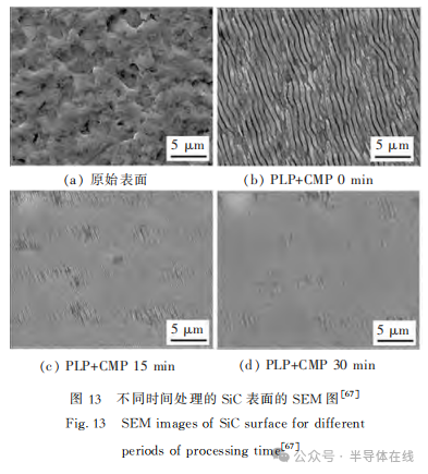 2021年,B.Gao等人提出了一種皮秒激光輔助CMP方法,首先用皮秒激光對SiC的Si面進行預處理,然后進行拋光。結(jié)果表明:皮秒激光預處理(PLP)產(chǎn)生的波紋和多晶層改善了表面加工性能,同時PLP氧化的C—O、Si—C—O和Si—O鍵易于材料去除。與非激光預處理樣品相比,激光預處理后樣品的材料去除率在拋光時前45 min顯著提高,而表面粗糙度顯著降低,如圖13所示。2021年,G.P.Chen等人采用納秒激光調(diào)制技術(shù)對SiCSi面進行預處理。結(jié)果表明,該技術(shù)可使表面氧含量增加,且氧化物成分一致,用Al2O3拋光液拋光后,Ra低至0.081nm。