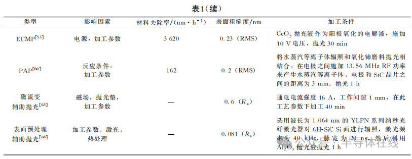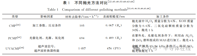 高效率地獲得光滑表面是半導體產(chǎn)業(yè)的一個關(guān)鍵問題,因此材料去除率和表面粗糙度被認為是評價單晶SiC拋光工藝兩個最重要指標。不同拋光方法之間的對比如表1所示。