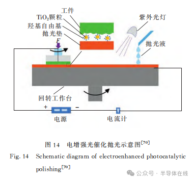 因此多個技術(shù)方向復合增效以達到化學氧化作用和機械去除作用同時提升的方法,引起了研究者的注意。比如,2019年,Y.He等人開發(fā)了一種用于4H-SiC晶圓Si面的電增強光催化拋光方法,如圖14所示。電流可以有效地防止半導體顆粒表面產(chǎn)生的電子與空穴的復合,從而提高拋光效率。以P25為光催化劑、H2O2為電子捕獲劑的拋光液拋光性能最好,MRR約為1180nm/h,在1.0μm×1.0μm范圍內(nèi),Ra約為0.053 nm。2019年,翟文杰等人對SiC進行了超聲-電化學機械研拋實驗。實驗結(jié)果表明,在試件與拋光盤之間的電壓為+10V時,材料去除率比無電壓時提高了55.1%;當對試件施加超聲-電場作用后,材料去除率比無超聲時提高了91.7%。