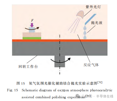 2021年,T.Yin等人采用高濃度氧氣氛圍與光催化輔助拋光相結(jié)合,對SiC襯底CMP特性進行了研究。結(jié)果表明:與常規(guī)空氣氣氛相比,將空氣氣氛中的氧(O2)分壓增加到300kPa,Si面和C面的材料去除率均增加超過2倍。實驗示意圖如圖15[72]所示。2022年,鄧家云使用Fe3O4作為催化劑,對電Fenton化學機械拋光進行了研究,利用電場參數(shù)控制CMP中·OH的生成速率和總濃度,實現(xiàn)·OH的持續(xù)、穩(wěn)定、可控生成,加速SiC的氧化腐蝕作用,從而達到與磨粒去除的協(xié)同效應(yīng),最終MRR為2358nm/h、Ra為0.372nm。