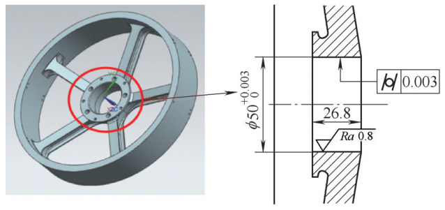 動(dòng)量輪利用陀螺定軸性和轉(zhuǎn)速變化而產(chǎn)生的反作用力矩,來(lái)穩(wěn)定或改變衛(wèi)星的姿態(tài)。動(dòng)量輪產(chǎn)品的加工精度直接影響整個(gè)航天器的運(yùn)行壽命、控制精度和可靠性,而輪體內(nèi)孔的加工質(zhì)量則決定了動(dòng)量輪的整體裝配精度。該部位的形狀及尺寸精度要求極為嚴(yán)格,在實(shí)際生產(chǎn)中,由于內(nèi)孔采用常規(guī)車削和磨削無(wú)法保證尺寸和形狀公差,因此輪體內(nèi)孔精密加工成為動(dòng)量輪制造瓶頸。